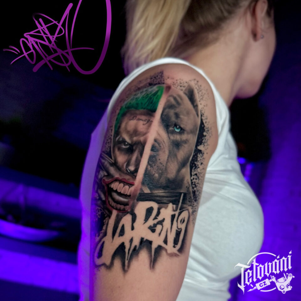 Tetování Joker z filmů a pohádek, zvíře pes Staford na rameno