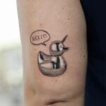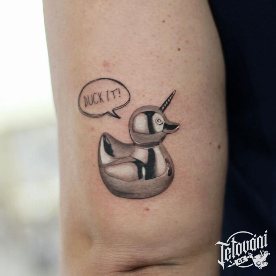 Tetování zvíře, pták, kačenka s nápisem na paži