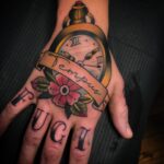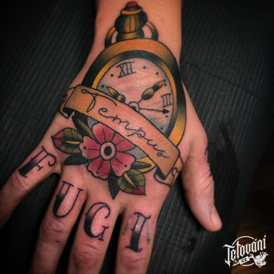 Tetování kapesní hodiny a nápis na hřbetu ruky