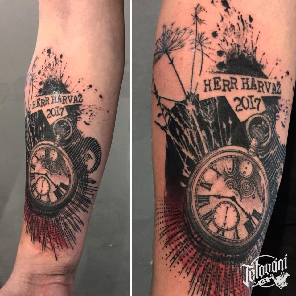 Tetování kapesní hodiny na předloktí