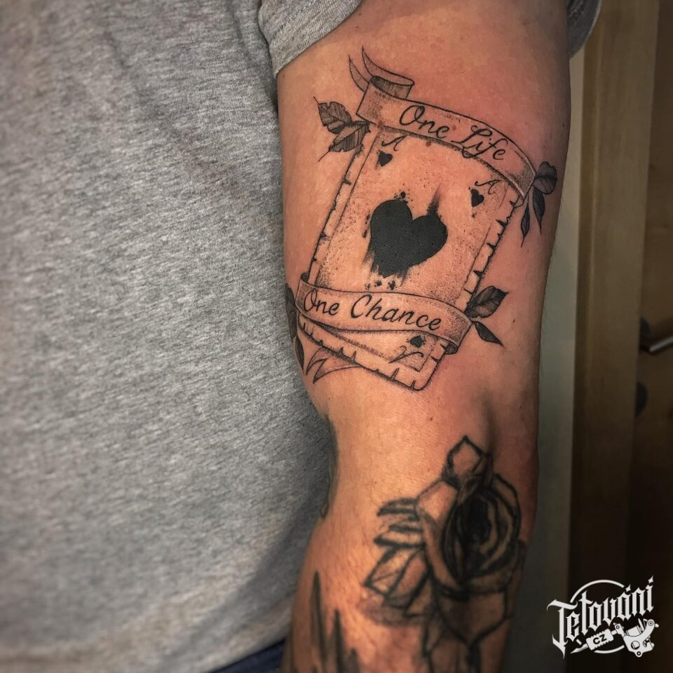 Tetování karta, eso s citátem na ruce