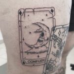Tetování karta s měsícem a nápisem na stehně