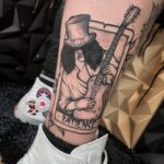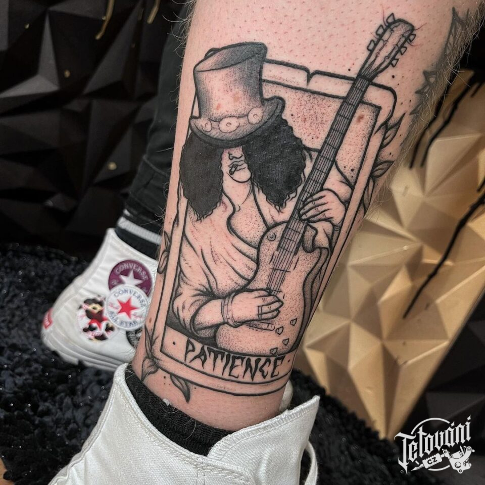 Tetování karta, symboly hudba, kytara, nápisy na lýtko