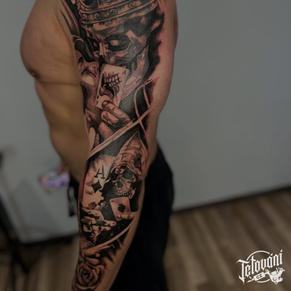 Tetování karty, esa, kostlivec, lebka s korunou, rukáv