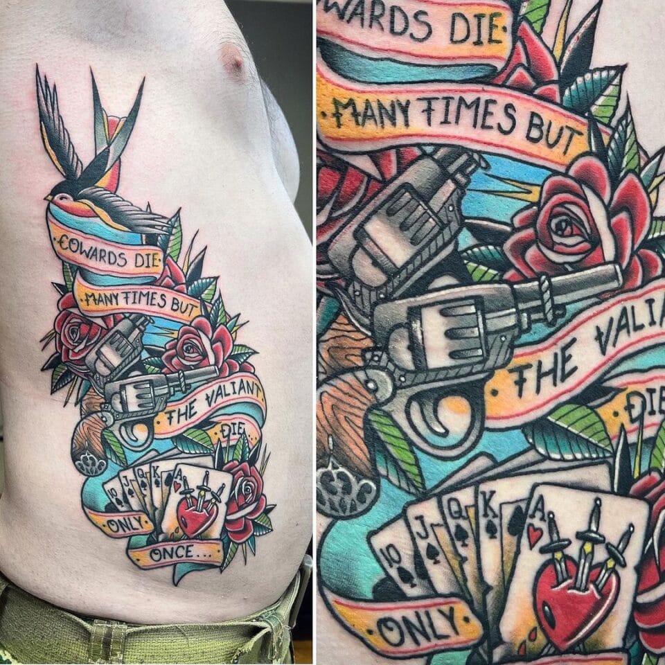 Tetování karty, nápisy, růže, srdce a meče na žebra