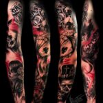 Tetování karty, přesýpací hodiny a růže, portrét muerte, rukáv