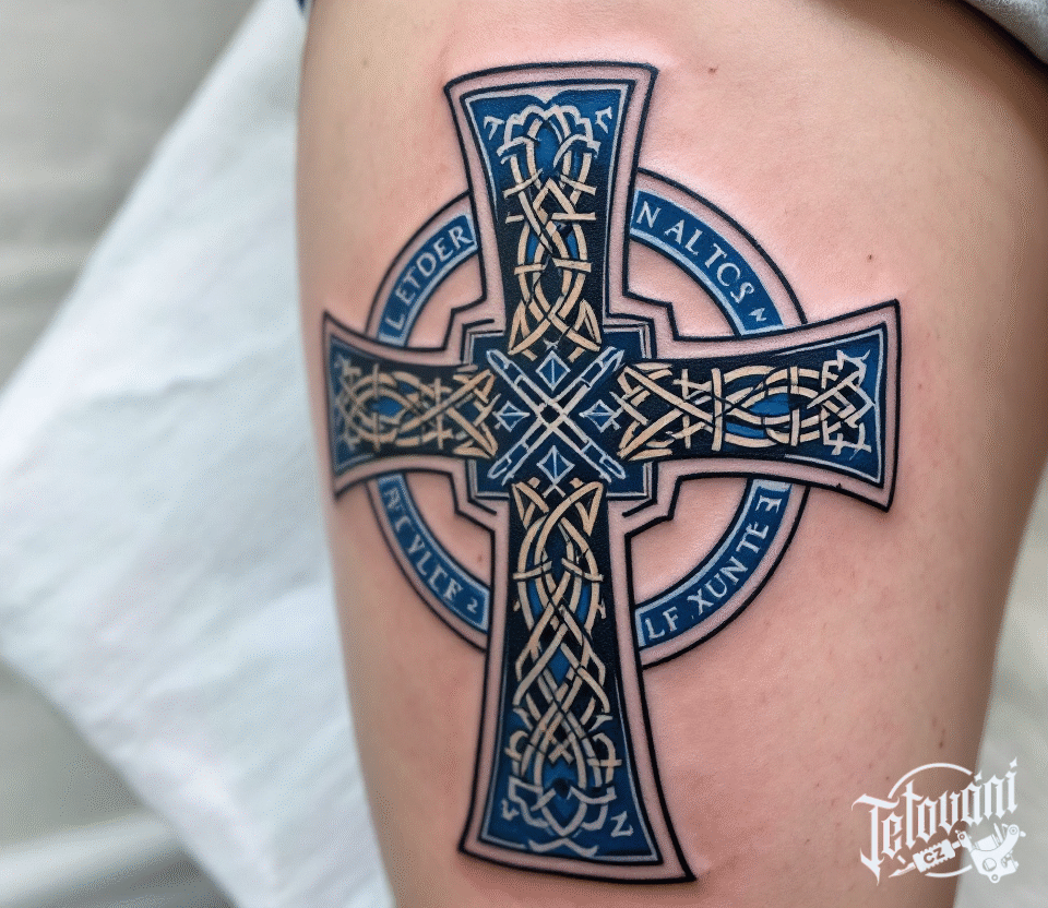 Tetování keltský kříž na stehno