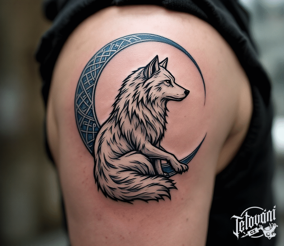 Tetování keltský vlk a měsíc na rameni