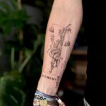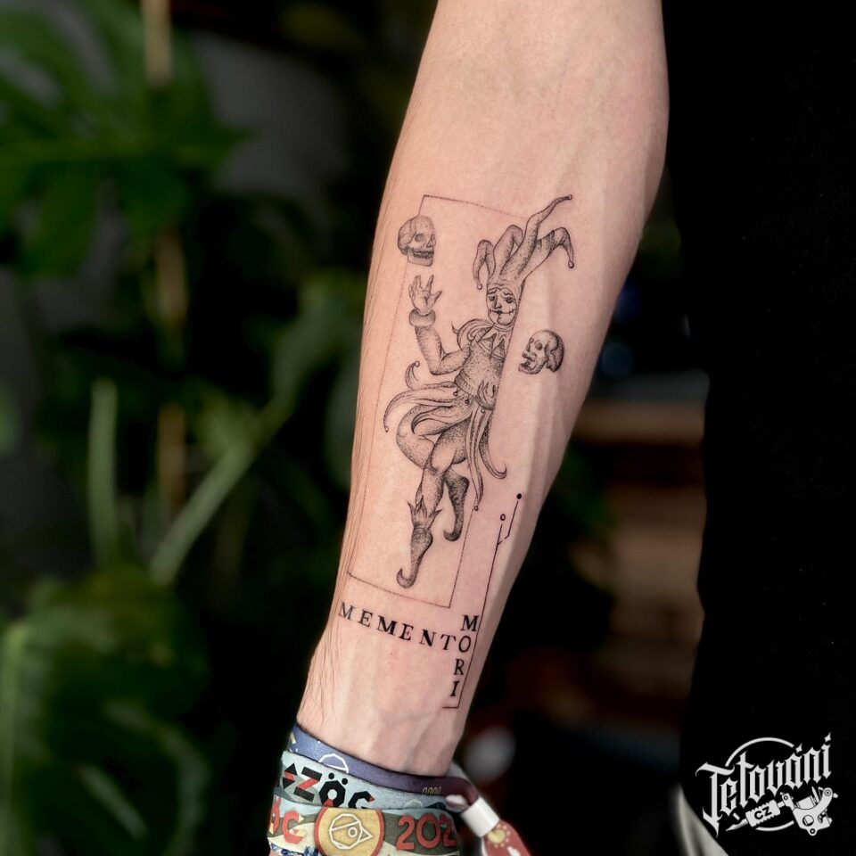 Tetování klaun, šašek s lebkami a nápisy na předloktí