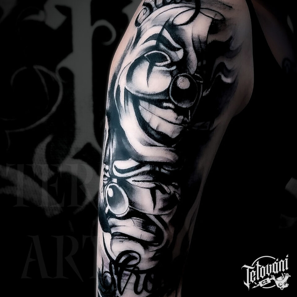 Tetování klaun z filmů a pohádek, maska na rameno