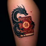 Tetování kniha a drak na stehno