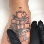Tetování knihy, květiny, znaky a symboly života na nárt