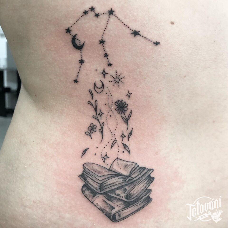 Tetování knihy, ornamenty, hvězdy na bok