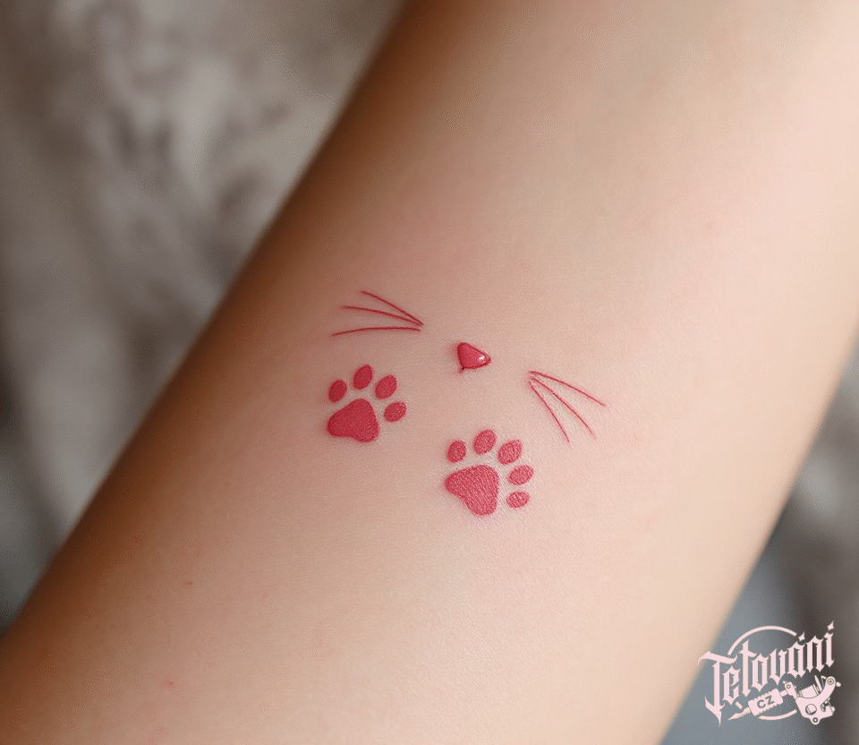 Tetování kočičí tlapky, čumáček a fousky na předloktí