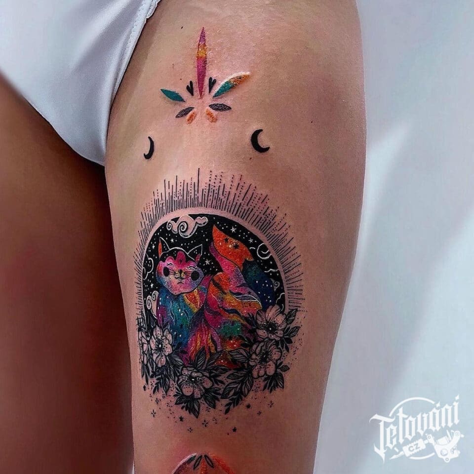 Tetování kočka a liška na stehně