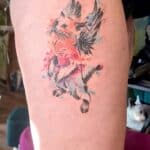 Tetování kočka s křídly na boku stehna