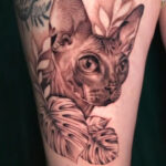 Tetování kočka s květinami na stehno