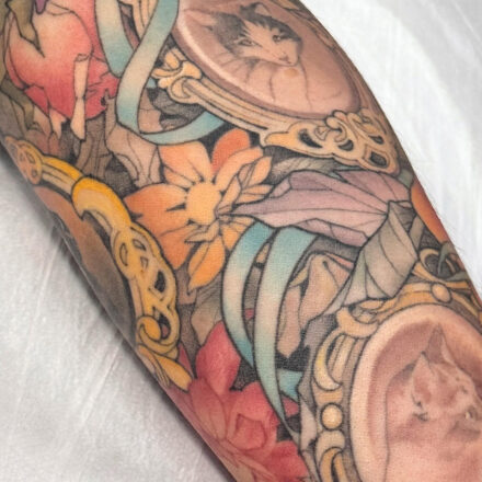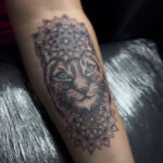 Tetování kočka s mandalama na předloktí