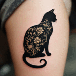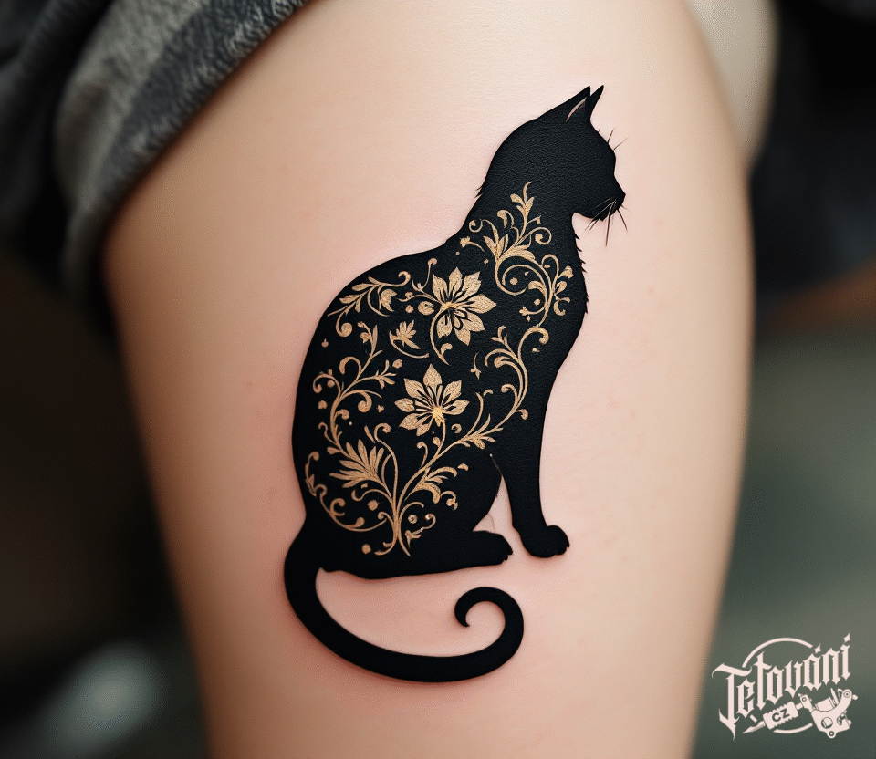 Tetování kočka silueta s květinami na boku stehna