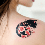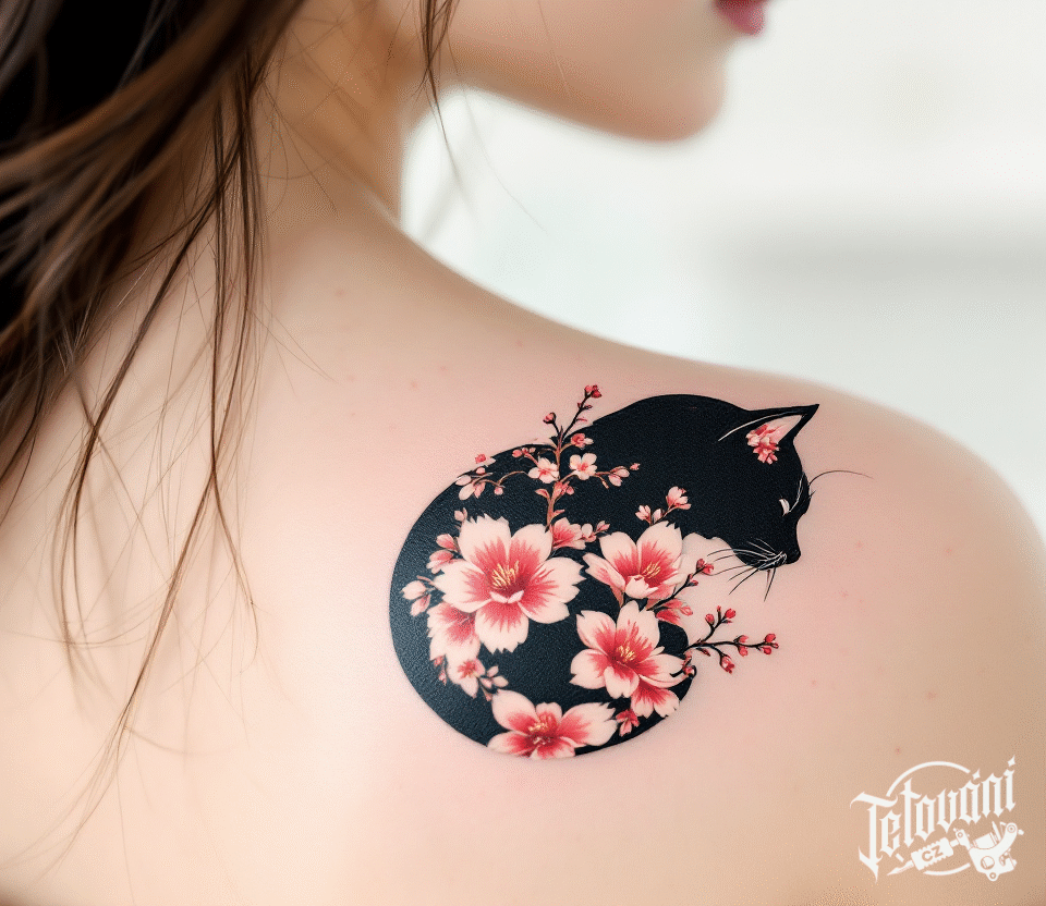 Tetování kočka silueta se sakurami na rameni