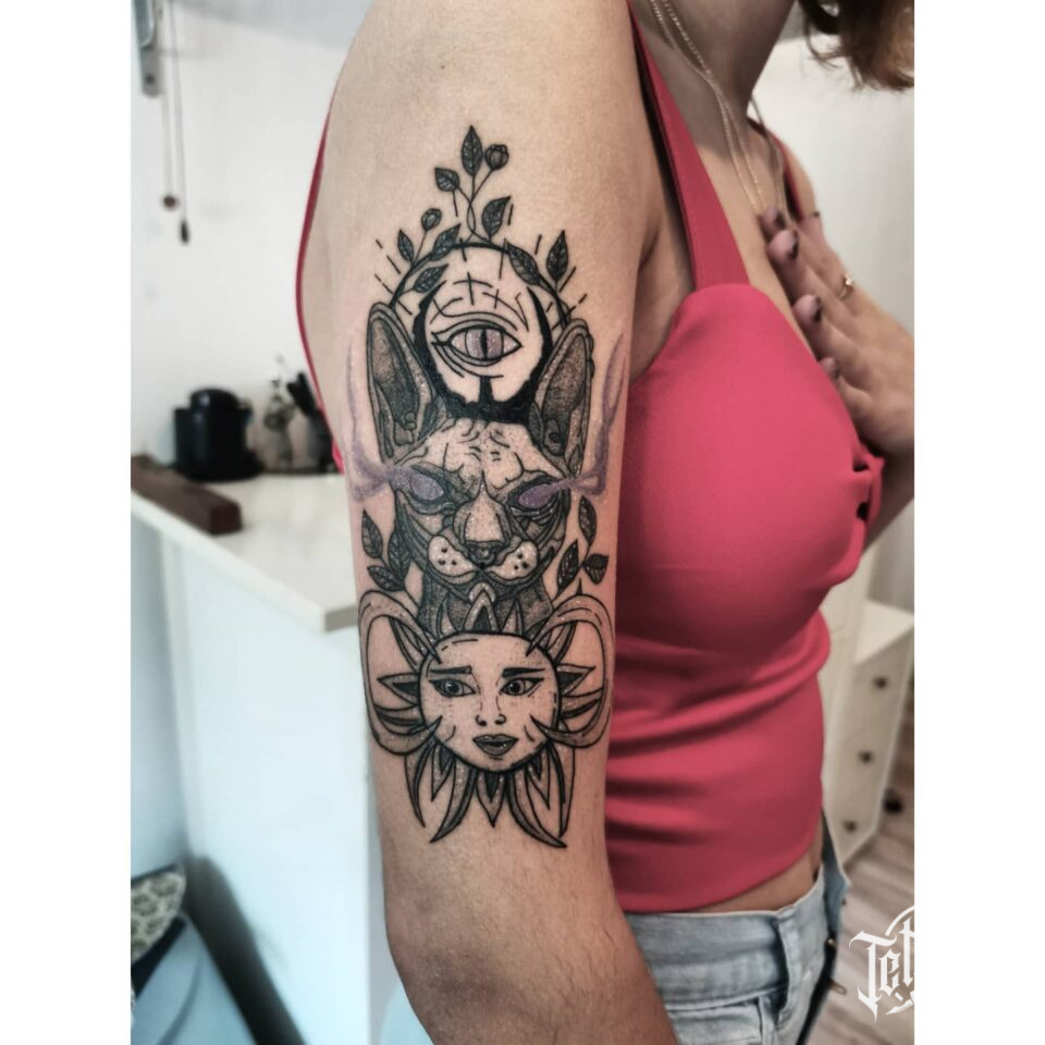 Tetování kočka, slunce, oko na paži