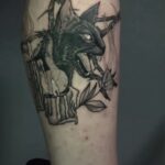 Tetování kočka, svíčky, pentagram na lýtku