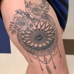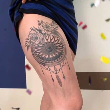 Tetování kolo, květiny, ornamenty na bok stehna