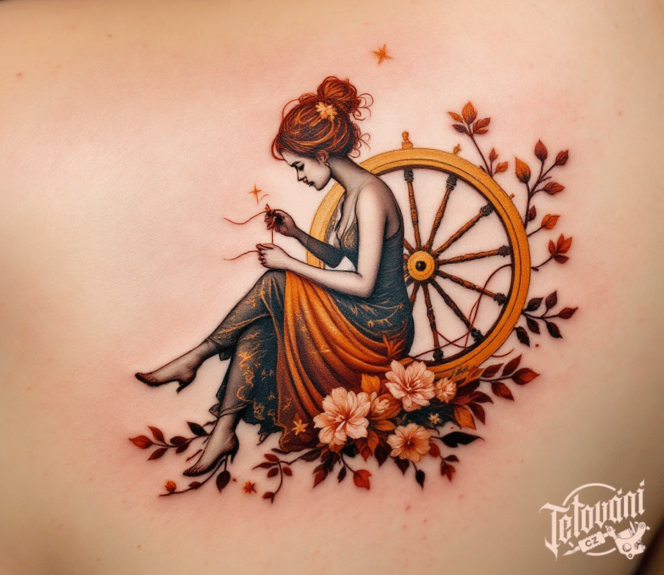 Tetování kolovrat a švadlena na záda