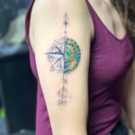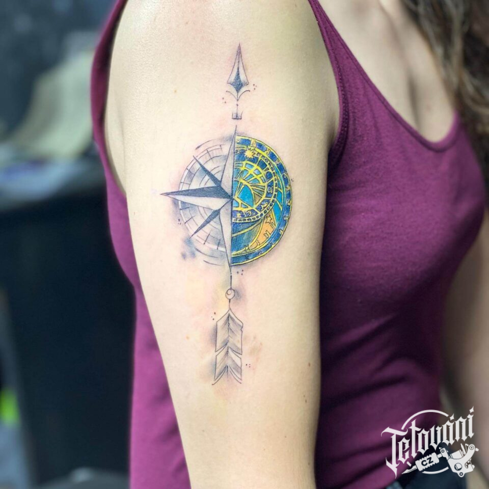 Tetování kompas a barevné hodiny na paži