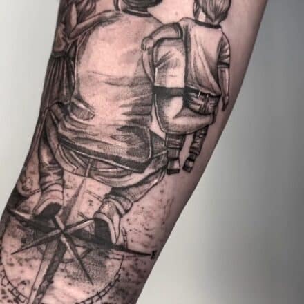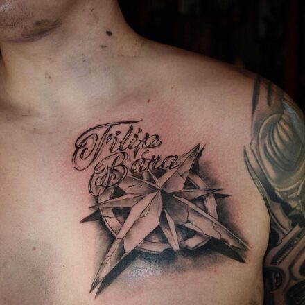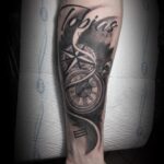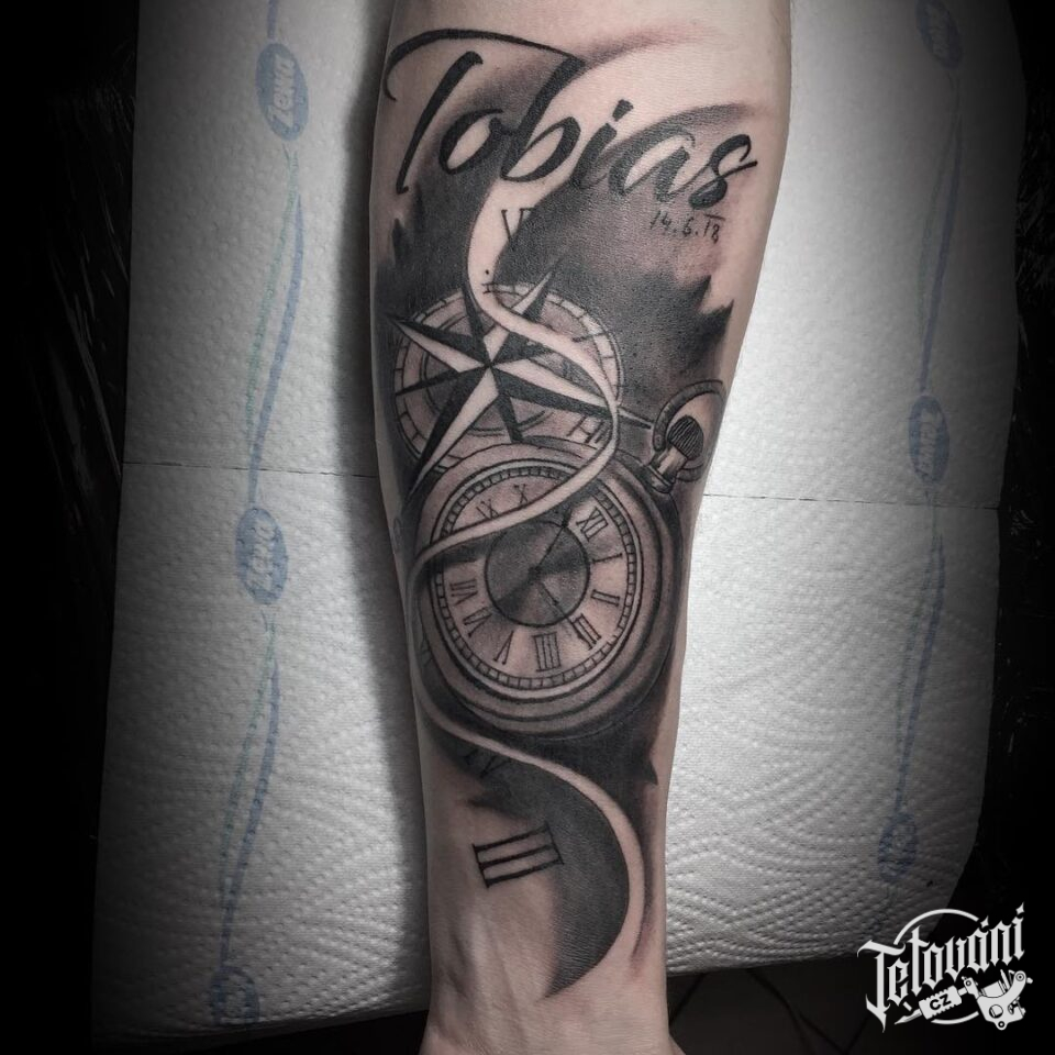 Tetování kompas, hodiny se jménem, nápis na předloktí