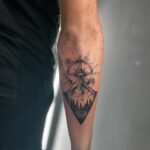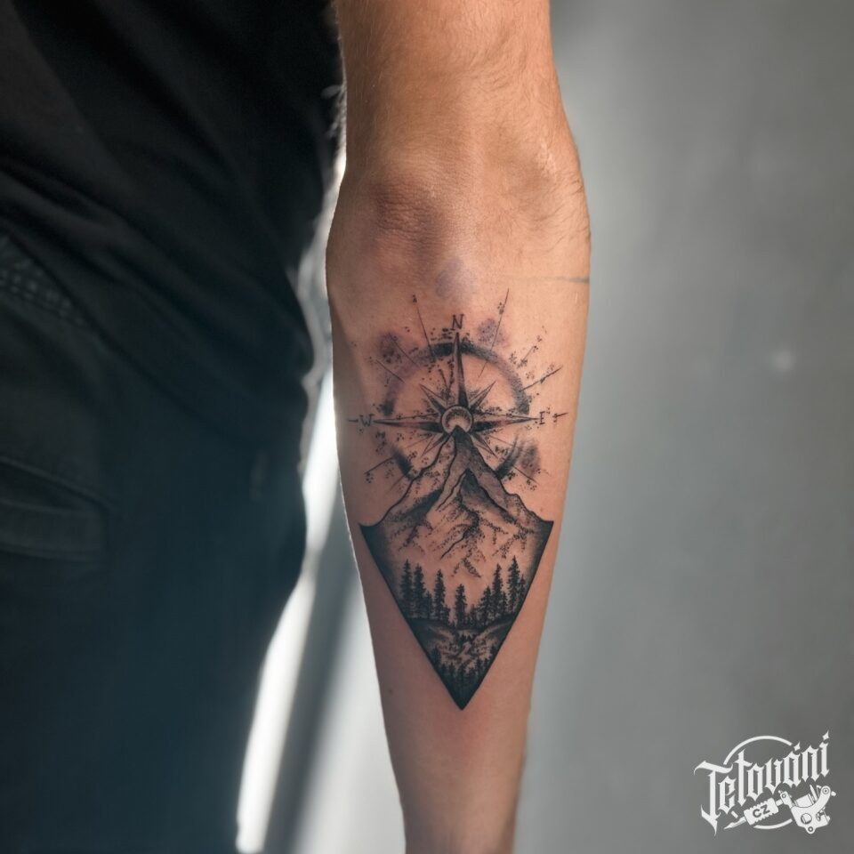 Tetování kompas, příroda, hory, les na předloktí