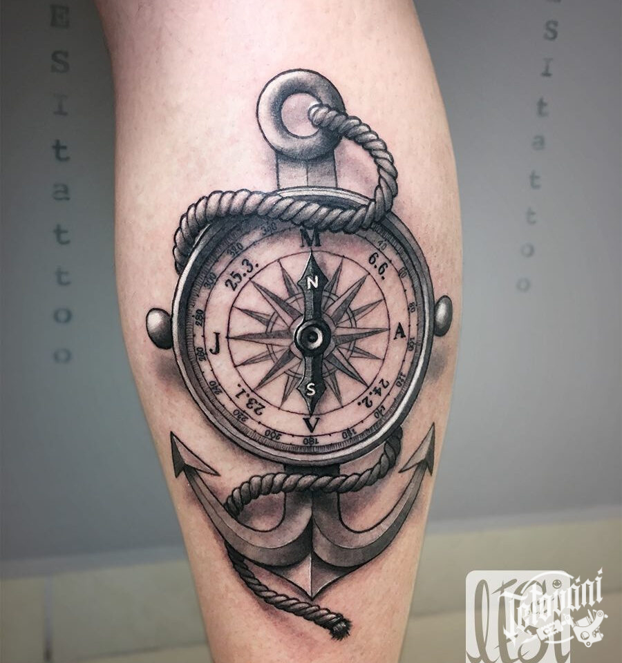 Tetování kompas s kotvou na lýtku