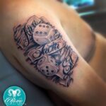 Tetování kostky, hrací kostky a nápisy, jména na rameno