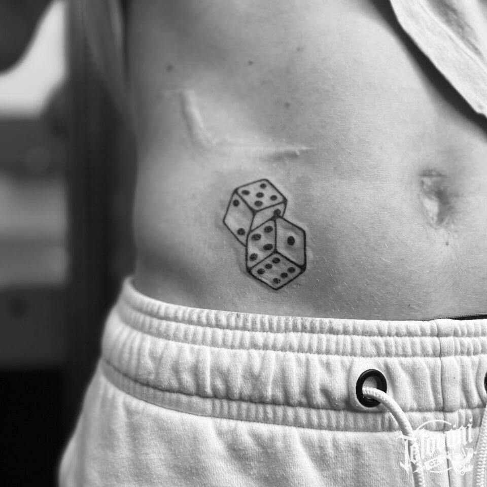 Tetování kostky, hrací kostky na břichu