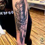 Tetování kostlivá ruka s nože na předloktí