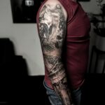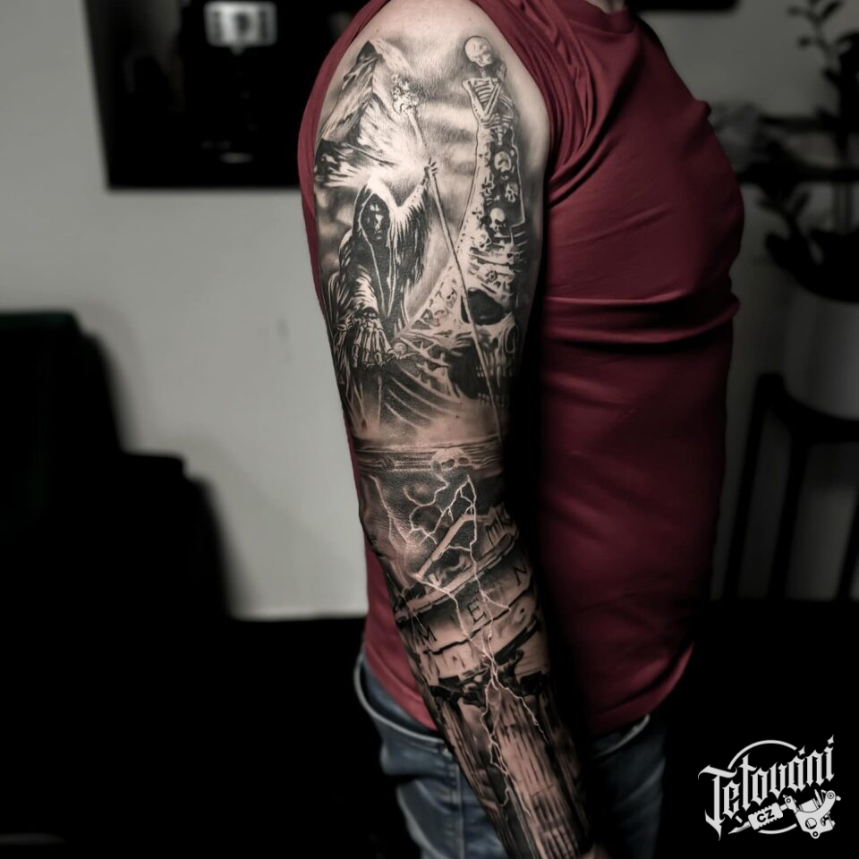 Tetování kostlivec, blesky, lebky, rukáv