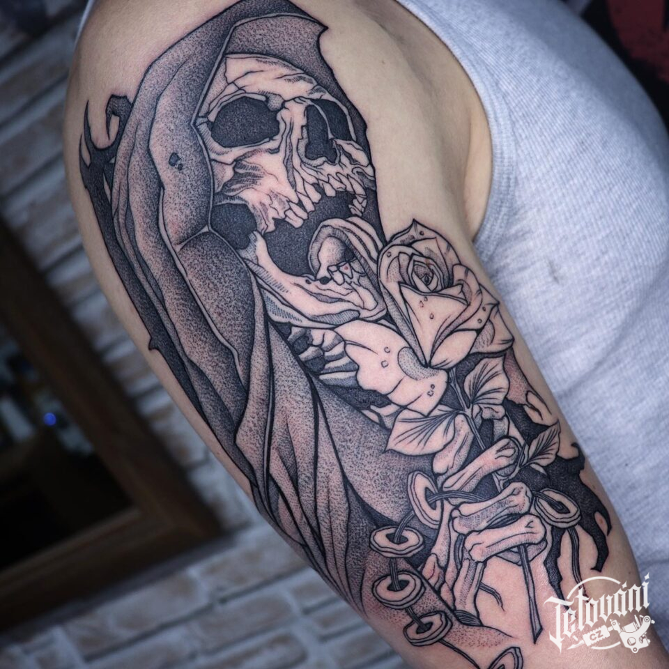 Tetování kostlivec, růže na paži