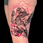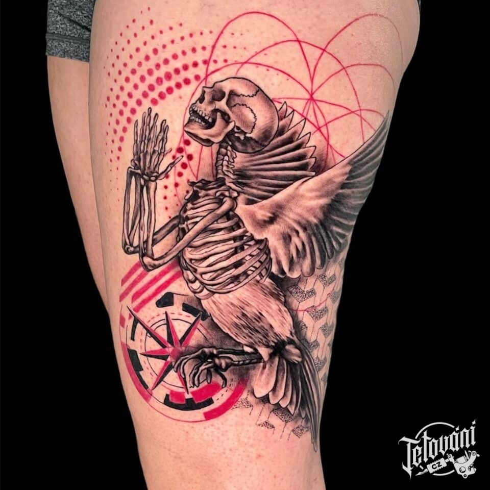 Tetování kostlivec s křídly, znaky a symboly na bok stehna
