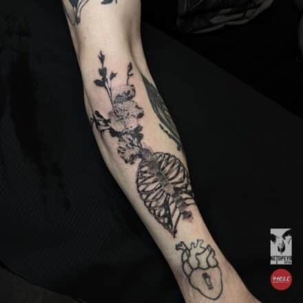 Tetování kostlivec s vlajkou, metalový motiv, hudba metal na rameno