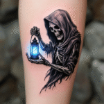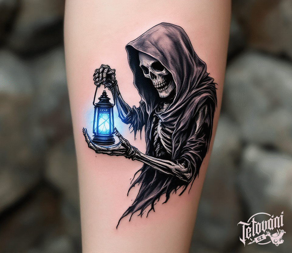Tetování kostlivec, smrtka s lucernou na předloktí