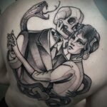 Tetování kostra a žena s hadem symbol lásky na záda