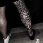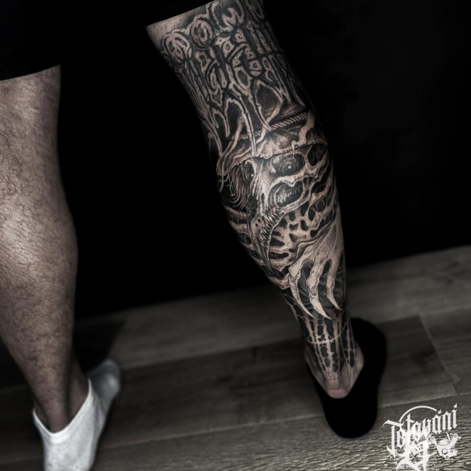 Tetování kostra, nápisy na lýtku