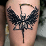 Tetování kostra s kosou na stehno