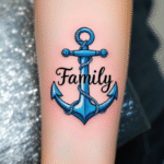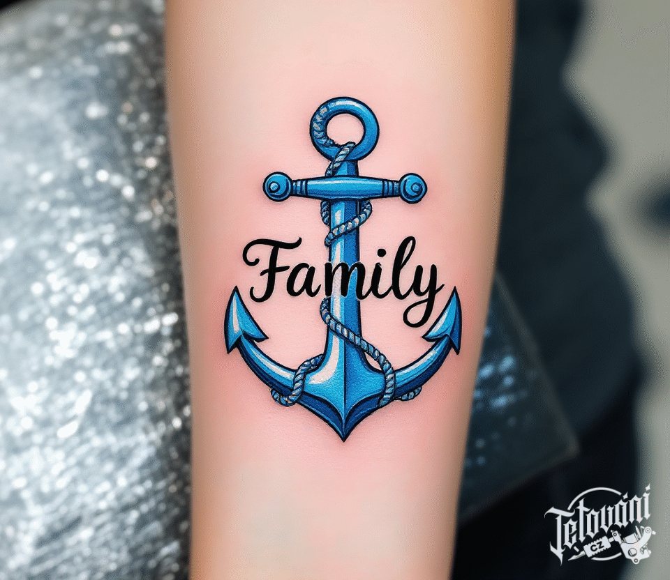 Tetování kotva s nápisem family na předloktí