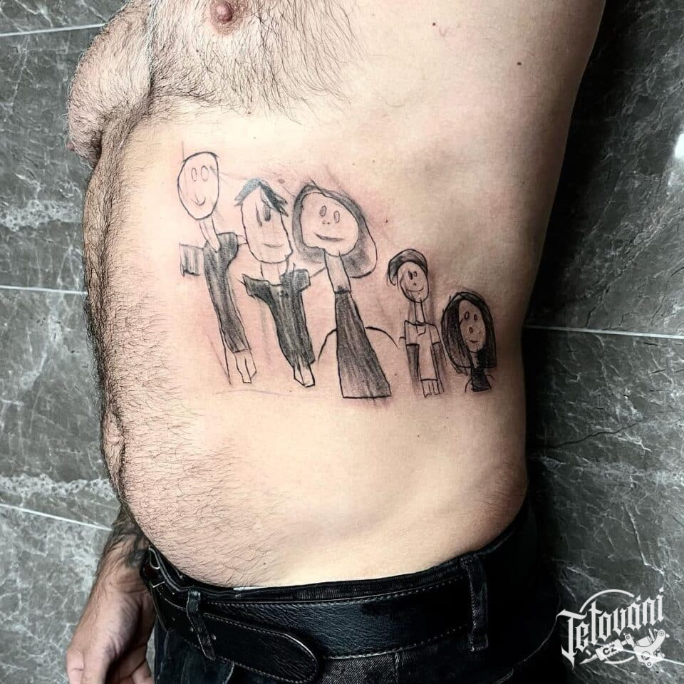 Tetování kresba dítěte, postavičky, symbol rodiny na žebra