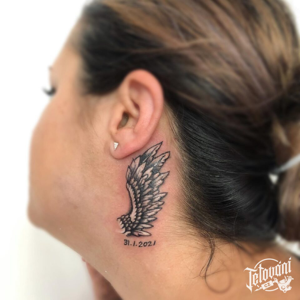 Tetování křídla, datum, za ucho