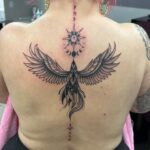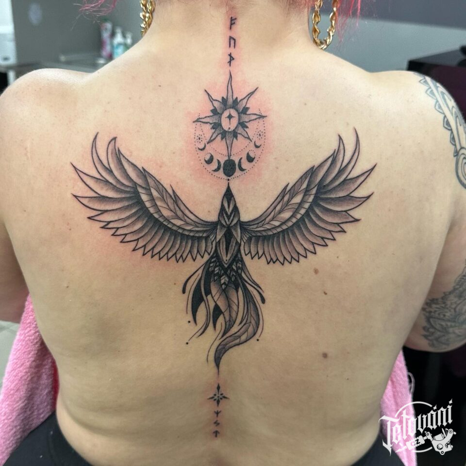 Tetování křídla, měsíc, pírka, symboly na páteř a lopatky