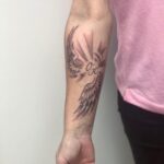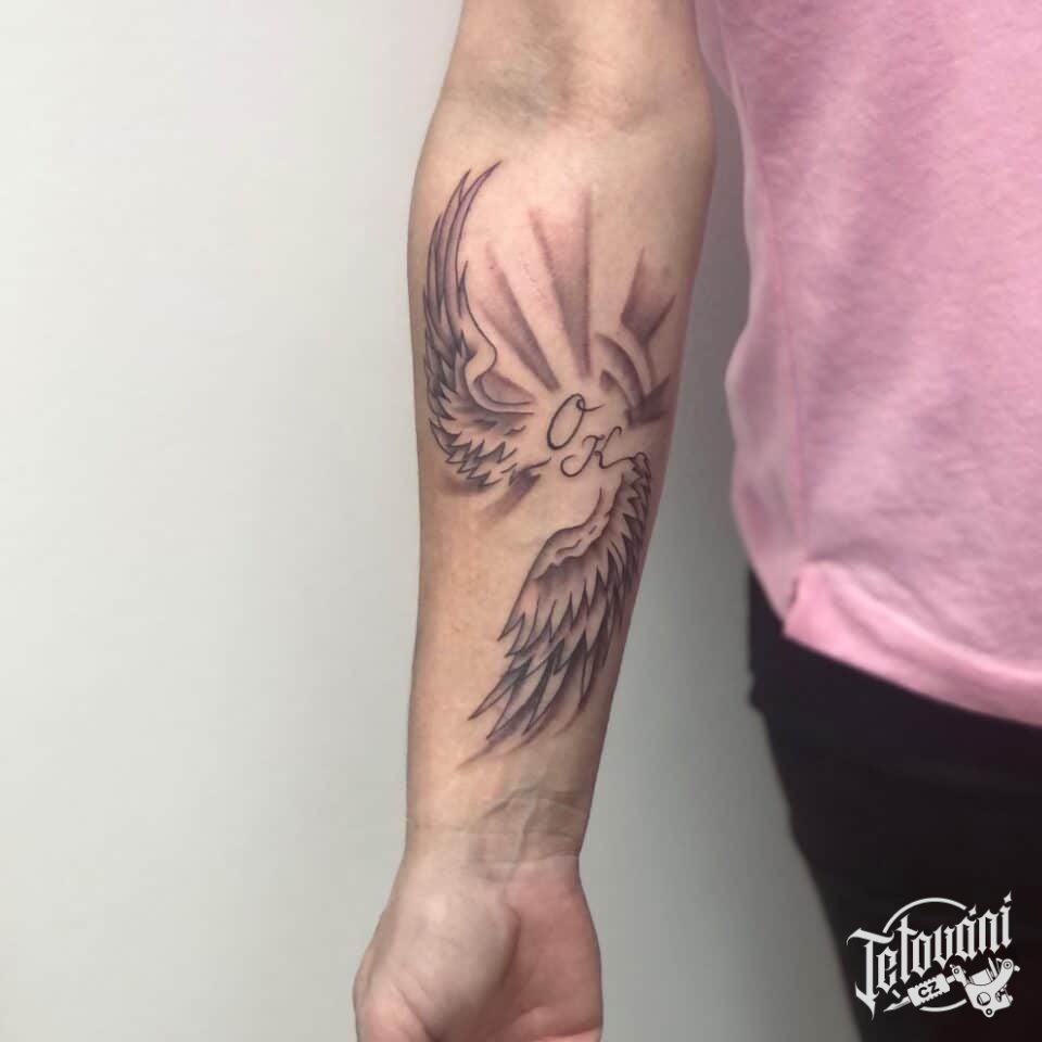 Tetování křídla, písmena, nápis, symbol rodiny na předloktí