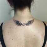 Tetování křídla s písmenem, nápisy na záda
