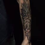 Tetování křídlo, mýtická bytost drak, zvíře vlk a symboly na předloktí